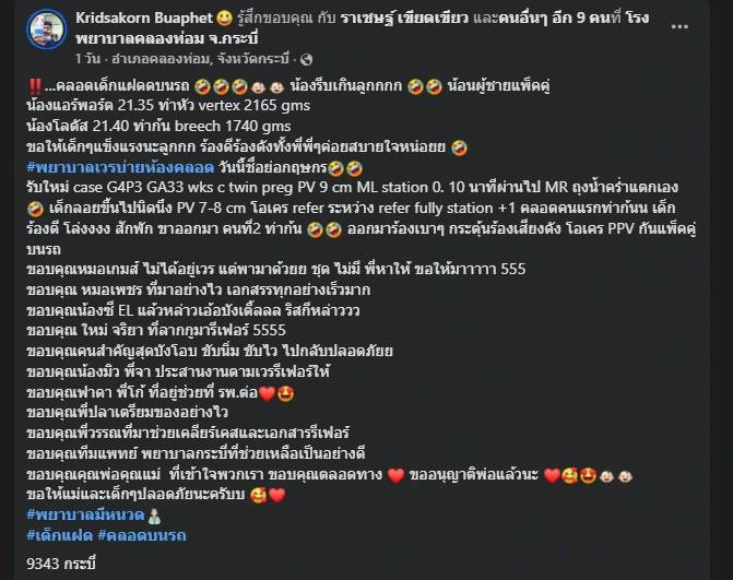 เป็นอีกหนึ่งเหตุการณ์สุดประทับใจที่ถูกแชร์ต่ออย่างรวดเร็วในโลกออนไลน์ เมื่อผู้ใช้เฟซบุ๊ก Kridsakorn Buaphet เจ้าหน้าที่โรงพยาบาลคลองท่อม จังหวัดกระบี่ ได้โพสต์เล่าเหตุการณ์สุดระทึกปนอบอุ่นใจ หลังหญิงตั้งครรภ์ใกล้คลอดรายหนึ่งให้กำเนิด “ลูกแฝดชาย” บนรถระหว่างทางไปโรงพยาบาล เมื่อช่วงกลางดึกของวันที่ 30 ตุลาคมที่ผ่านมา